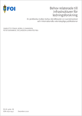Denna rapport redovisar resultat från ett pågående arbete med att identifiera behov och ge rekommendationer för utformning av infrastruktur som stödjer vetenskapliga studier inom ledningsområdet. Med infrastruktur avses i denna rapport personal, processer, lokaler, tekniska system, mjukvaror och annat som stödjer ledningsforskning. Denna rapport jämför nationella behov kopplade till infrastrukturer för ledningsforskning identifierade av FOI med internationella vetenskapliga studier som har publicerats det senaste årtiondet. Resultaten redovisar likheter respektive skillnader mellan de identifierade behoven. Likheterna påvisar generella behov som är aktuella för flertal studier inom ledningsforskning, medan skillnaderna belyser behov som är mer specifika för ledningsforskning vid FOI, huvudsakligen gällande termer för stödfunktioner snarare än direkta forskningsredskap. Analysen visar att endast fem av tio av FOI identifierade behov återfinns i litteraturen. Dessa fem är: flexibel fysisk utformning och ITarkitektur, metodstöd, teknikbehov, interoperabilitet samt träning, övning och utvärdering. Övriga behov som inte återfinns i litteraturen är samordningsansvar, ekonomisk modell, sekretess, intern samverkan och extern kommunikation.
