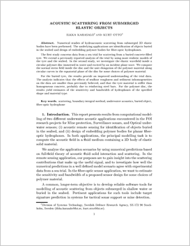 I rapporten presenteras resultat från två numeriska studier av hydroakustisk spridning från elastiska föremål. De bakomliggande tillämpningarna är identifiering av föremål begravda i havsbotten respektive utformning av polymerkroppar till fiberoptiska hydrofoner. I den första studien jämförs teoretiska prediktioner av det spridda fältet från ett begravt betongfyllt traktordäck med data från ett fältförsök. En tidigare rapporterad inledande analys av försöksdata kompletteras genom användning av mer realistiska modeller av det begravda däcket och havsbotten. I den andra studien undersöks det elastiska vågfält inuti en cirkulär skivformad polymerkropp som exciteras av en infallande plan våg. Normalspänningsfältet inuti kroppen samt töjningen av polymermaterialet längs cirklar i skivans ekvatorialplan beräknas för några olika val av material. För det begravda däcket erhålls en förbättrad förståelse av experimentresultaten. Analysen indikerar att inverkan av skrovlighet och inhomogeniteter i botten kan vara mindre än vad som trotts tidigare, samt att däcket är styvare än homogen cement troligen som följd av armering. För polymerkropparna fås resultat ur vilka känslighet och bandbredd hos hydrofoner av den givna formen och materialtypen kan uppskattas.