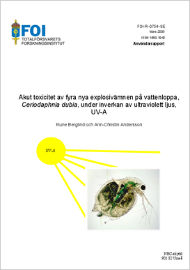 De explosivämnen som idag används inom försvaret uppfyller i många fall inte moderna miljökrav med avseende på biologisk nedbrytbarhet och toxicitet. Intensiv forskning pågår för att ersätta dagens miljöfarliga explosivämnen med nya som är mindre miljöfarliga. Inom ramen för projektet "Metoder för Miljöriskbdömning" genomförs forskning för att i ett tidigt skede karakterisera nya explosivämnens ekotoxikologiska egenskaper. I denna undersökning har den inverkan ultraviolett ljus (UV-A) har på den akuta giftigheten på CL-20, FOX-7, FOX-12 och ADN undersökts. FOX-7 hade ingen akuttoxisk effekt vid den högsta testade koncentrationen, 83 mg/l, i kombination med eller utan belysning med UV-A. För CL-20, FOX-12 och ADN ökade den akuta toxiciteten efter 6 timmare belysning med UV-A.
